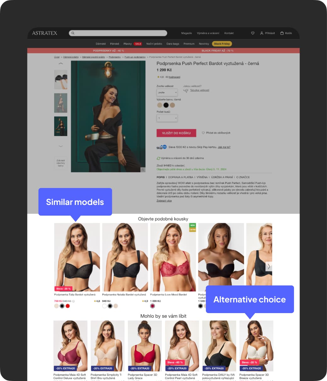 Astratex.cz is the largest lingerie and swimwear retailer in Central Europe with sales of over CZK 1 billion. Before deploying Perselio tools, Astratex used a proprietary recommendation system based on business rules requiring manual intervention.