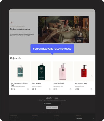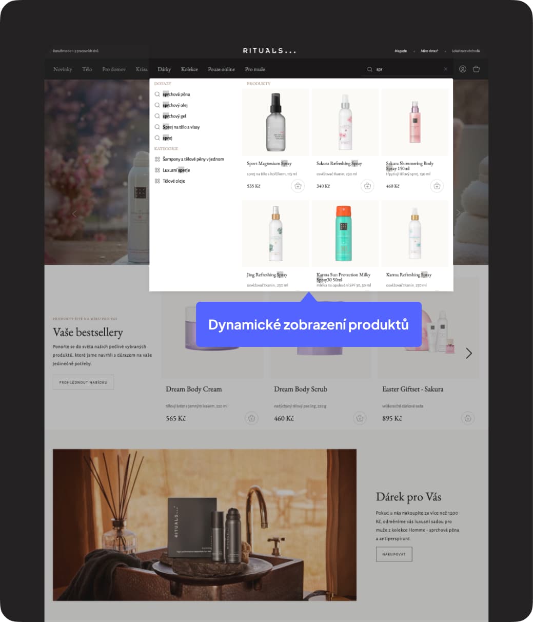 Díky jednoduché FE integraci neměli v Rituals CZ & SK starosti s přechodem na naše řešení. Vše jsme vyřešili na naší straně – jak design a odladění detailů rekomendačních ploch, přes nastavení vyhledávání vč. semantické funkce, až po vytvoření unikátního nákupního rádce – Vyhledávač dárků, jako separátní webové aplikace pro přirozenou komunikaci se zákazníky.